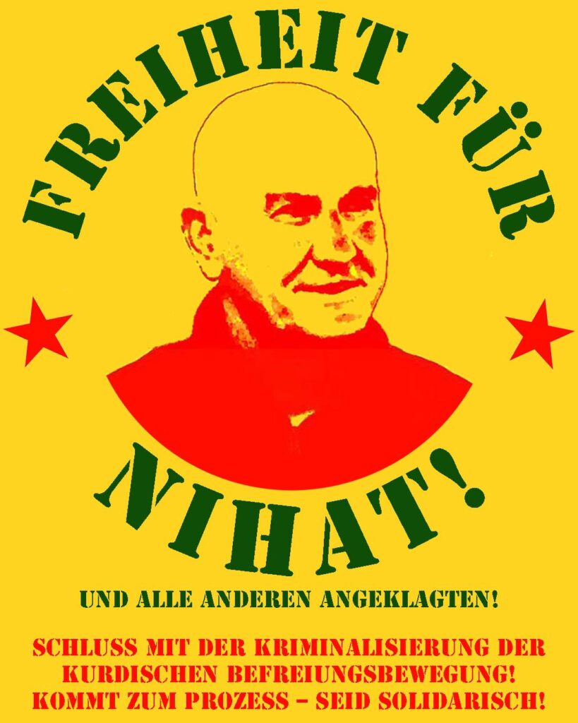 Unzählige Male waren wir zusammen mit Nihat auf der Straße, um internationale Solidarität mit dem revolutionären Aufbau in Kurdistan zu bekunden. Lasst uns ihm jetzt, wo er stellvertretend für unsere gemeinsame Sache weggesperrt ist und abgeurteilt werden soll, dasselbe zukommen lassen. Kämpfen wir entschlossen dafür, dass Nihat schon bald wieder draußen an unserer Seite stehen wird.