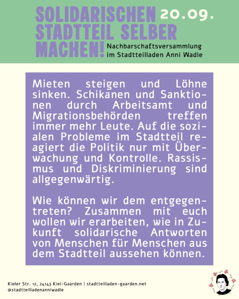 Mieten steigen und Löhne sinken. Schikanen und Sanktionen durch Arbeitsamt und Migrationsbehörden treffen immer mehr Leute. Auf die sozialen Probleme im Stadtteil reagiert die Politik nur mit Überwachung und Kontrolle. Rassismus und Diskriminierung sind allgegenwärtig. Wie können wir dem entgegentreten?