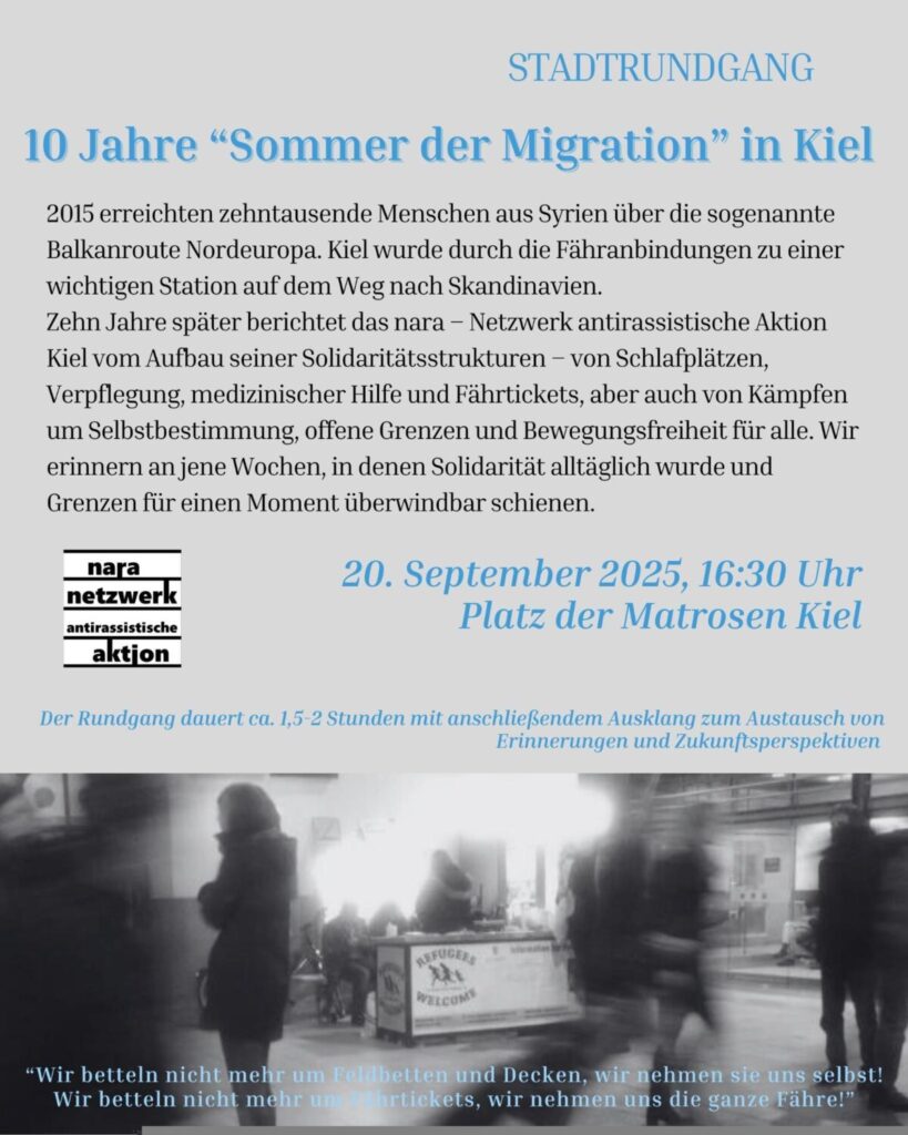 2015 erreichten zehntausende Menschen u.a. aus Syrien über die sogenannte Balkanroute Nordeuropa. Kiel wurde durch die Fähranbindungen zu einer wichtigen Station auf dem Weg nach Skandinavien. Zehn Jahre später berichtet das nara – netzwerk antirassistische aktion kiel vom Aufbau seiner Solidaritätsstrukturen – von Schlafplätzen, Verpflegung, medizinischer Hilfe und Fährtickets, aber auch von Kämpfen um Selbstbestimmung, offene Grenzen und Bewegungsfreiheit für alle. Wir erinnern an jene Wochen, in denen Solidarität alltäglich wurde und Grenzen für einen Moment überwindbar schienen.
